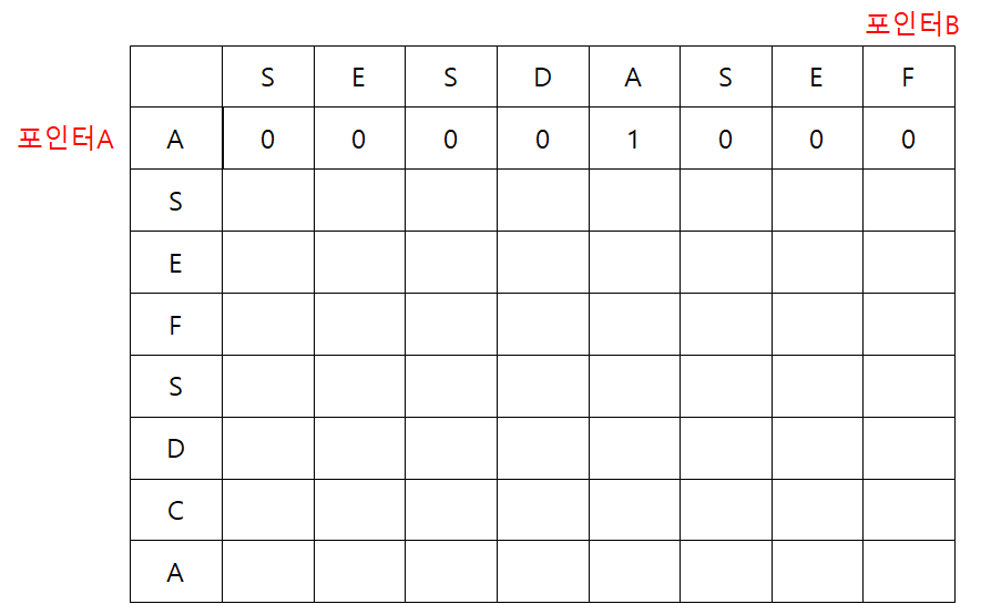 포인터A를 고정하고 포인터B를 이동시켜보았다. 동일한 문자 A를 제외하고는 모두 0을 넣어준다.