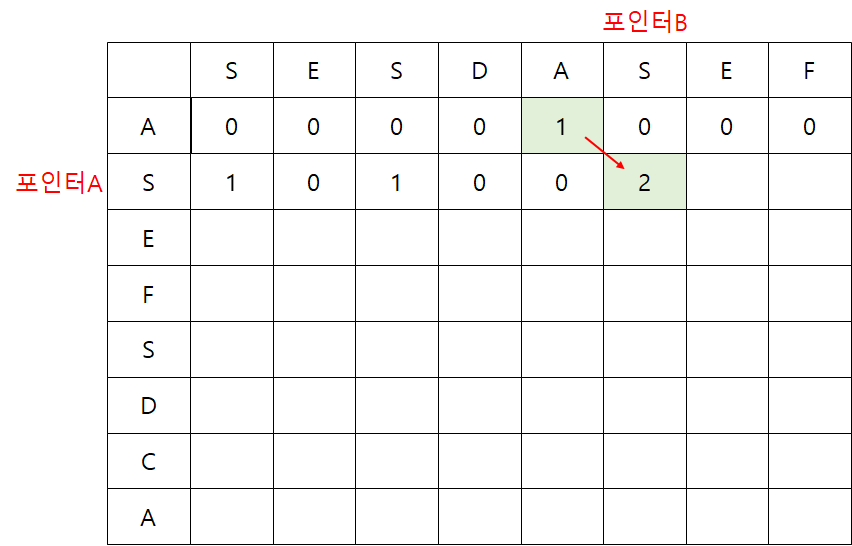 포인터A와 포인터B가 한 칸씩 이동했을 때, 두 포인터가 가리키는 문자가 동일하면 2에 +1을 한다. 만약 동일하지 않으면 0을 넣는다. 0을 넣으므로써 연속이 끝났음을 나타낸다.