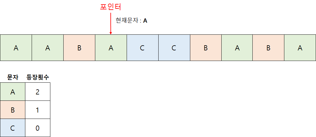 1) 포인터로 문자열을 검사해서 문자별 등장횟수를 카운트한다.