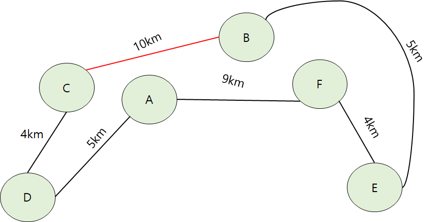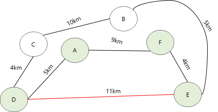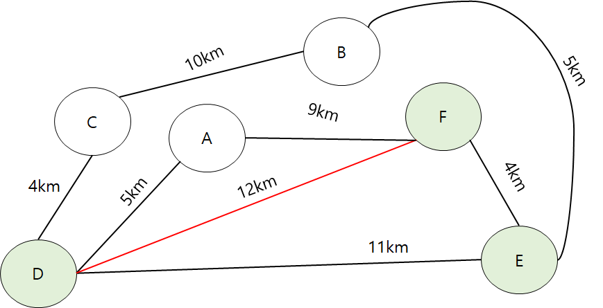 D와 F를 잇는 간선이 12km로 가장 길다. 고로 제거한다.