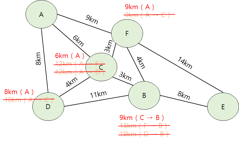 경우 중 최소를 제외한 나머지는 제거한다. 이런 방식으로 각 노드의 최단 경로 길이를 구한다.