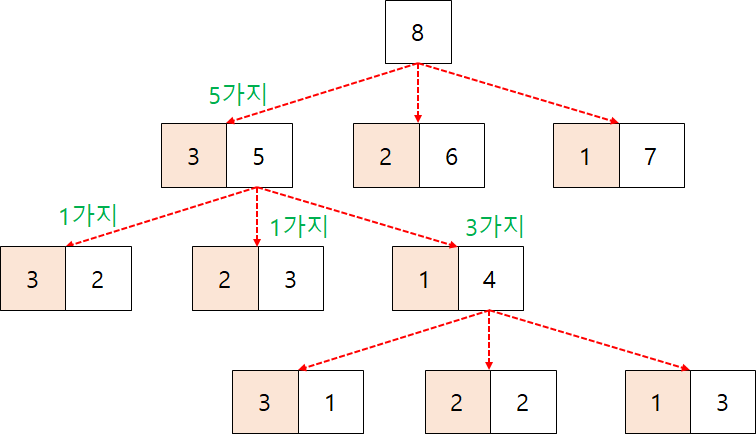 1, 2, 3을 더해 8을 만드는 경우의 수를 구하는 문제이다. 동적계획법의 TopDown 방식으로 접근해보자.