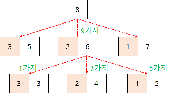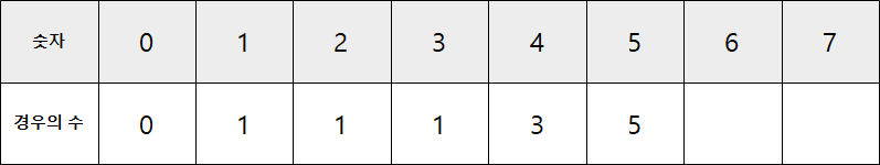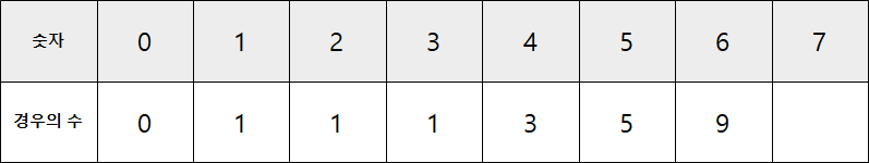 3은 1가지이다. 4는 3가지이다. 5는 5가지이다. 모두 배열에 저장된 값이므로 작은 단위로 분할할 필요가 없다. 숫자 6이면 경우의 수는 9가지이다.