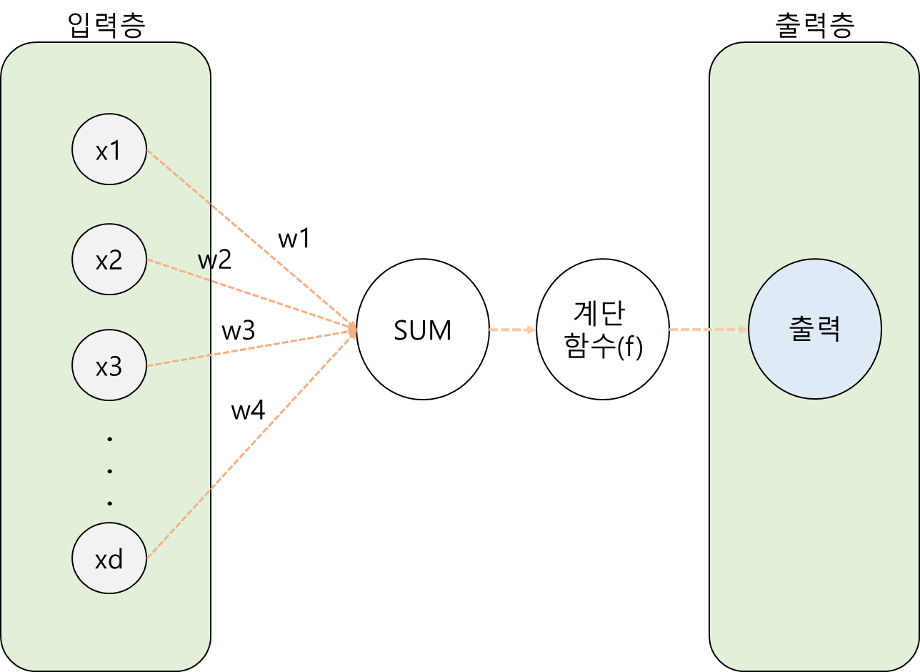 다양한 입력값을 받으면 가중치(w)를 곱한 후 모두 더한다(sum). 그리고 계단함수(f)의 변수로 sum을 넣어 f(sum)을 구한다. 계단 함수는 sum이 특정값(Θ)보다 크면 1이고 작으면 -1을 출력하는 함수이다.