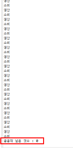 이와 같이, Lock을 확보하는 과정에서 원자성이 확보되자, 서로 상호배제를 깨뜨리지 않고 번갈아가면 count에 접근하였다. 그리고 공공재 남은 갯수도 0개로 count 공유 자원이 훼손되지 않음을 확인 할 수 있다.