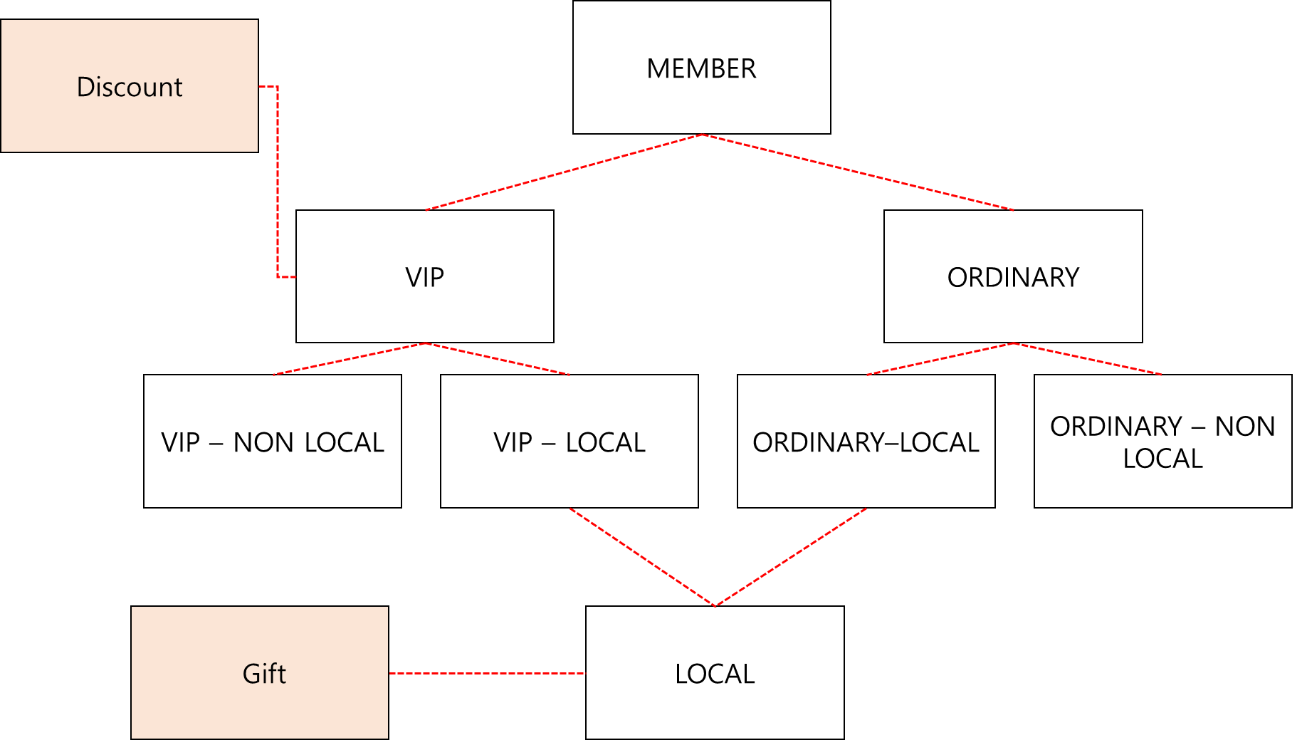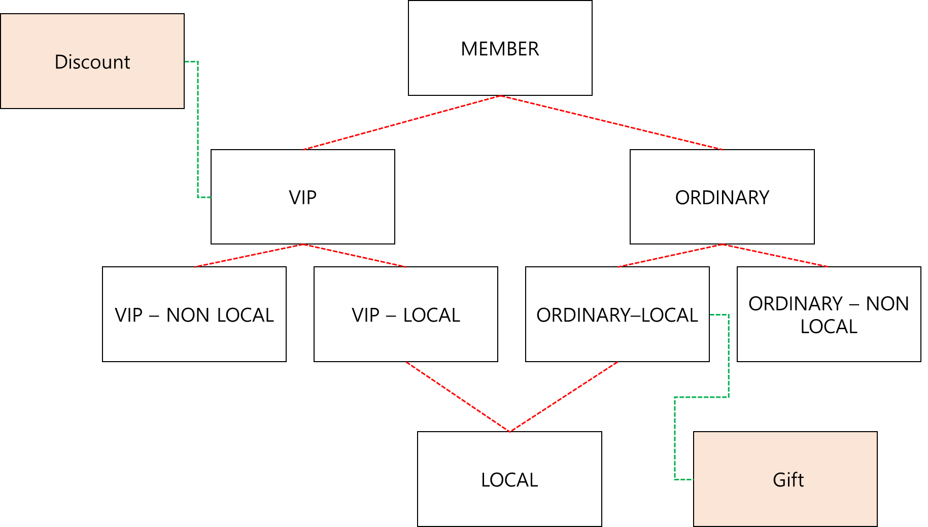 여기서 요구사항이 추가되었다고 가정해보자. 지역(Local) 주민들은 기프티콘을 받는다. VIP이면서 지역주민일 수 있고 일반 회원이면서 지역주민일 수 있다.