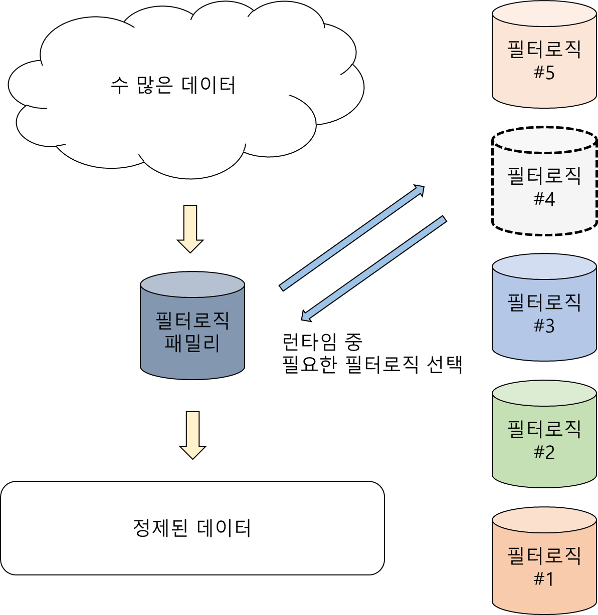 런타임 중, 필요한 로직을 가져와 사용할 뿐, 필터로직패밀리(인터페이스)는 바뀌지 않는다. 그러므로 요구사항이 바뀌면 필터로직만 새로 추가해주면 된다. 코드를 통해 보자.