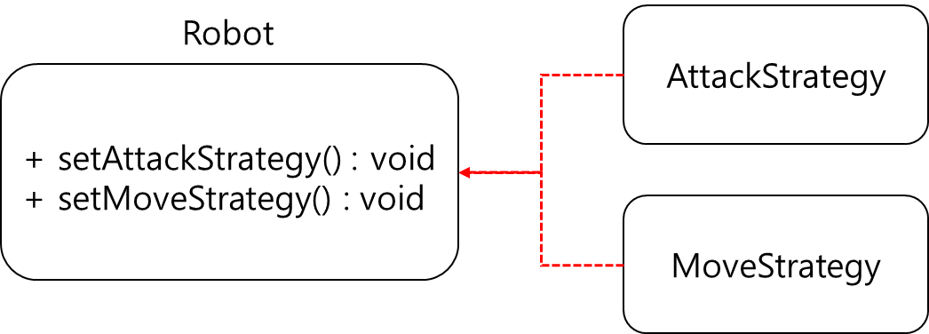 Robot 클래스 내부에 메소드로 attack과 move 전략이 알고리즘으로 박혀일을 때와는 달리, Robot클래스와 Strategy 인터페이스는 setter 함수로 연결한다. 이로써 언제든 Robot 클래스의 수정없이 Attack과 Move 전략을 바꾸어 줄 수 있다.