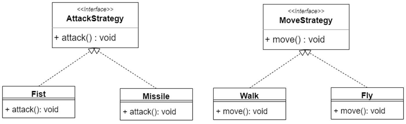 공격과 이동 전략을 인터페이스로 분리한다.