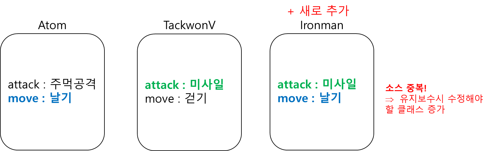 Ironman 클래스는 부모클래스의 메소드를 Override 한다. 문제는 TakwonV와 Ironman 클래스의 attack() 메소드가 소스 중복이 생기고 Atom클래스와 Ironman 클래스 사이에 move() 메소드에 소스 중복이 생긴다. 이처럼 자식클래스는 부모클래스의 메소드를 Override하면서 소스 중복이 생기고 이로인해, 유지보수가 힘들어 진다.