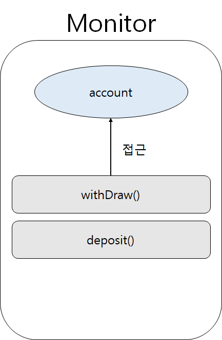 스레드 하나가 프로시저 withDraw()에 접근하면, withDraw()는 스레드 대신 account에 접근한다. Monitor에는 한 스레드만 접근 가능하므로, 스레드가 deposit() 프로시저를 사용하지 않아도 다른 스레드는 deposit() 프로시저에 접근할 수 없다.