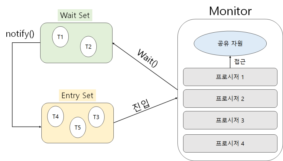 JAVA에서 synchronized 키워드가 사용된 객체는 공유 객체가 된다. JVM은 해당 객체를 토대로 Monitor를 만든다. '공유 자원'은 동기화된 (synchronized) 메소드가 접근하는 공유 객체의 필드가 된다. 그리고 동기화된 메소드들은 '프로시저'가 된다. 스레드가 모니터에 접근하면, 스레드는 공유자원에 직접 접근할 수 없다. 무조건 프로시저를 통해 접근해야 한다.