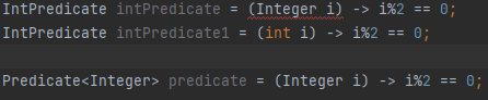 IntPredicate는 기능은 Predicate와 같지만 int기본형만 파라미터로 받는 함수형 인터페이스이다. 그래서 Integer 형식의 변수를 인수로 넣으면 컴파일에서 오류가 발생한다. 이처럼 메모리 관리가 필요한 경우, 기본형 데이터를 파라미터로 받는 함수형 인터페이스를 사용 할 수 있다.