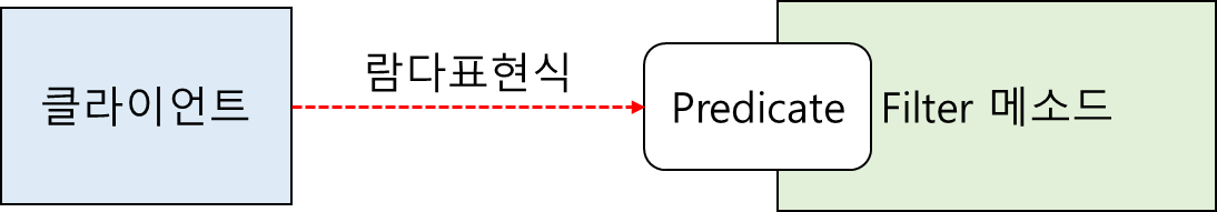 필터링에 자주 변경되는 로직은 '참'과 '거짓'을 구분하는 '분류기준'이다. Filter 메소드가 로직에 종속되어 버리면 유지보수성이 떨어진다. 그러므로 boolean형을 Return하는 Predicate를 메소드의 인수로 받고 분류로직은 클라이언트의 입맛에 따라 람다표현식으로 코드를 넘긴다.