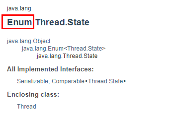 JAVA API 문서에서 Thread에 대한 내용을 보면, Thread는 중첩 static 클래스로 State 클래스를 갖고 있음을 알 수 있다. 중첩클래스란 한 클래스 블록 안에서 정의된 또 하나의 클래스를 의미한다. 재미있는 것 중첩된 State 클래스는 보통의 클래스가 아니다.