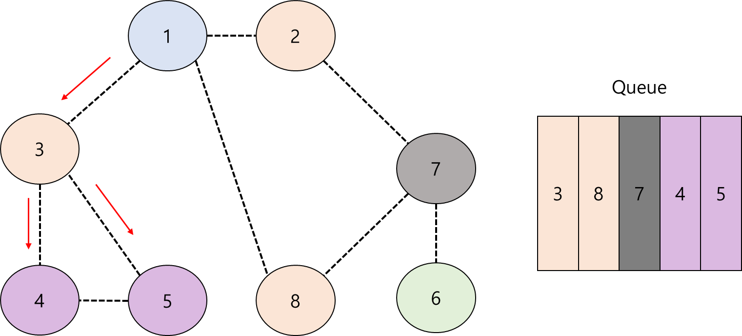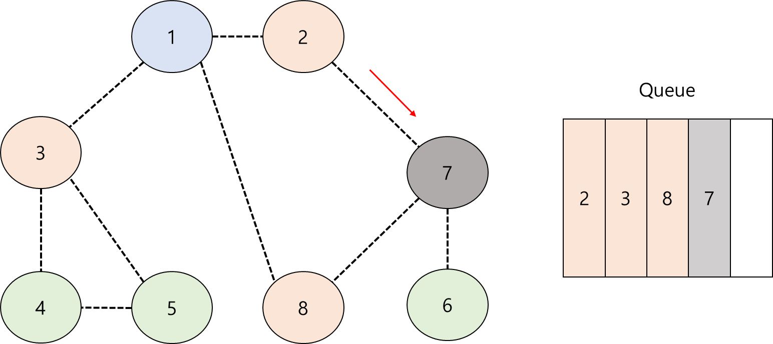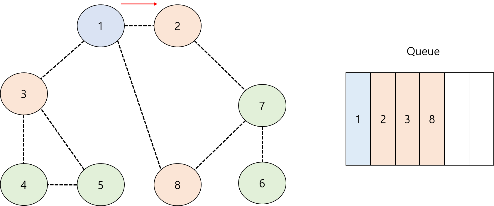 그러므로 특정노드의 인접노드를 먼저 탐색하는 방식은 큐(Queue)로 구현하는 것이 적당하다.