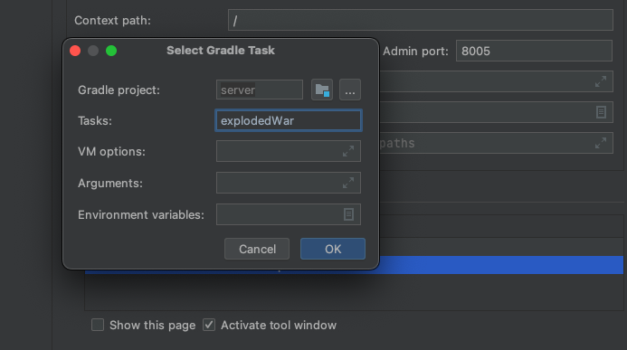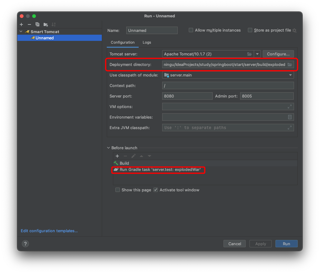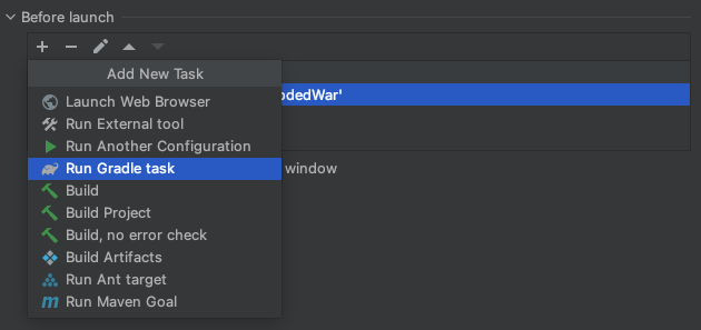 그러므로 톰캣이 실행되기 전에, exploded 폴더에 war 파일 압축을 풀어 디렉토리 형태로 Copy 해놓아야 한다. Before Launch 영역에서 아래 Groovy 소스의 task가 실행되도록 설정해놓아야 한다.