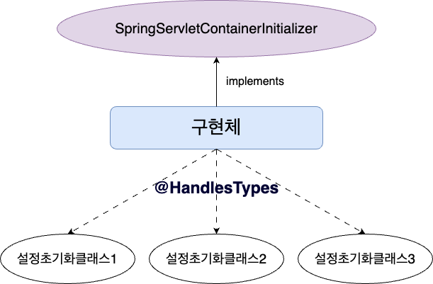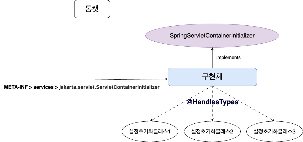 SpringServletContainerInitializer 인터페이스는 톰캣이 실행되기 전, 설정을 초기화하는 기능을 제공한다. 초기화하고 싶은 설정은 개발자가 구현체를 만들어 구현한다.