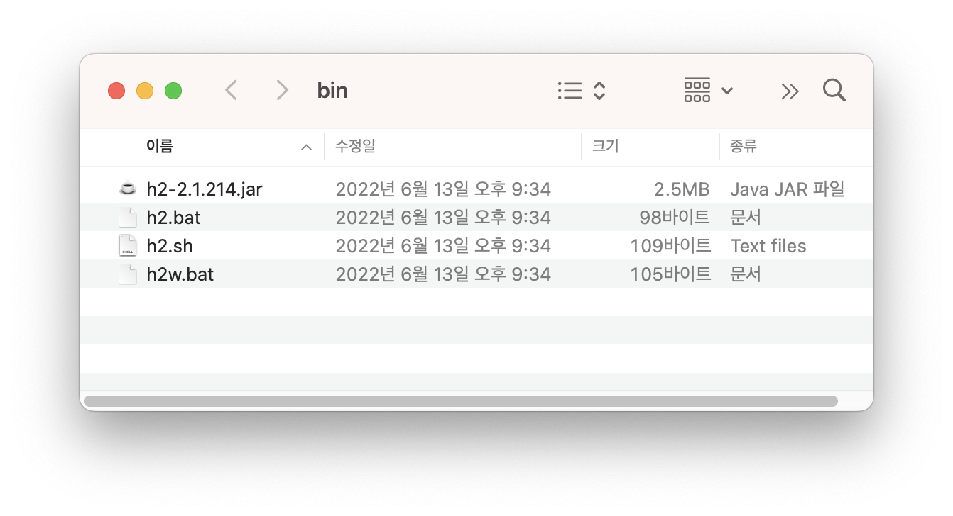 Mac인 경우, 터미널에서 > sh h2.sh로 실행시키면되고 윈도우는 h2.bat을 실행시키면 된다.