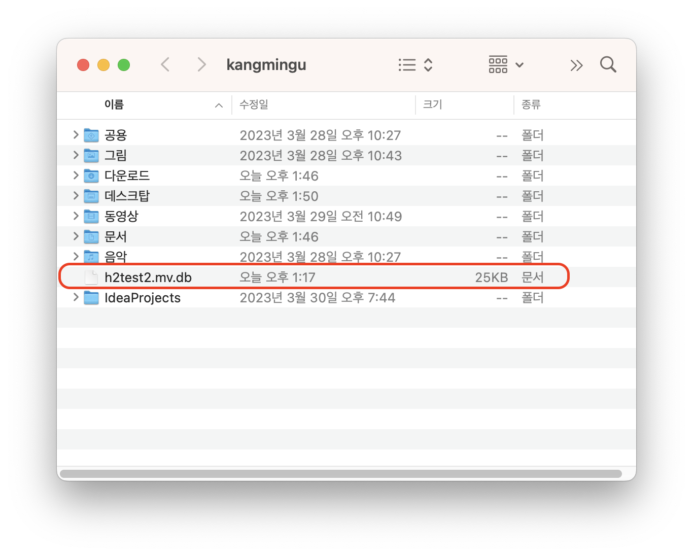 datasource 설정을 위 파일과 같이 넣어준다. jdbc드라이버는 h2드라이버이고 url을 넣어주면 그 위치에 [입력한 파일명].mv.db 파일이 생성된다. mv.db 파일은 DB정보, 테이블과 삽입된 데이터 정보를 저장된 파일이다. 이렇게 위 설정만 넣으면 끝이다.