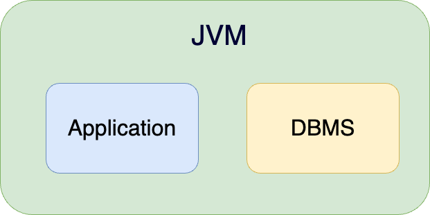 JVM 프로세스 하나에 Application과 h2 db가 모두 동작하는 것이다. 하나의 프로세스에서 동작하면 메모리 및 cpu를 공유하므로 속도도 빠르다. 따로 TCP 통신을 할 필요가 없어진다.