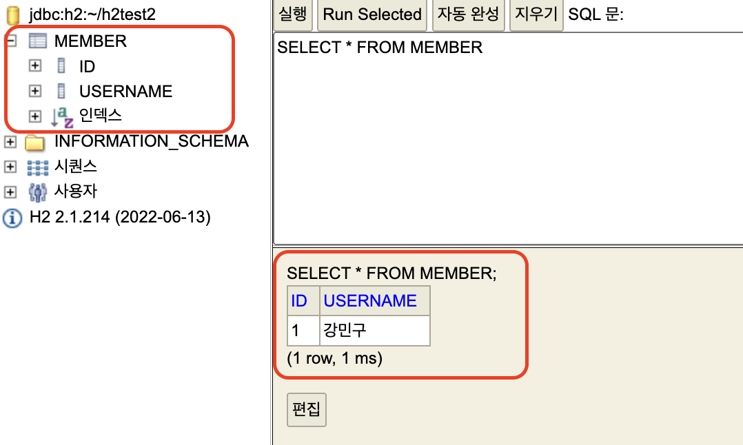DB에 회원정보를 삽입하고 삽입한 데이터를 다시 조회한다. 그리고 삽입데이터와 조회데이터가 일치하는지 확인한다. 만약 기존방식이었다면 DB를 설치하고 테이블을 생성하고 DBMS를 실행시키는 등의 각종 설정을 해야한다. 그러나 h2 Embeded모드는 한 가지 설정만 넣어주면 된다.