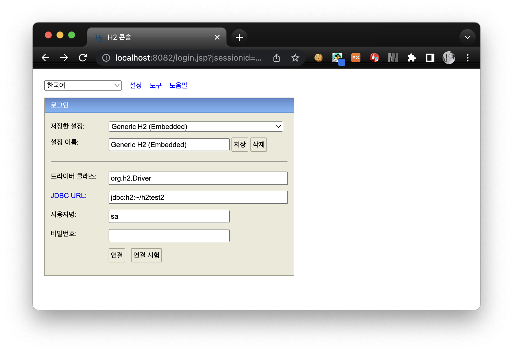 url: jdbc:h2:~/h2test2 #띄어쓰기 4칸