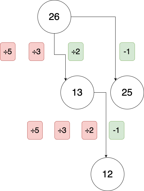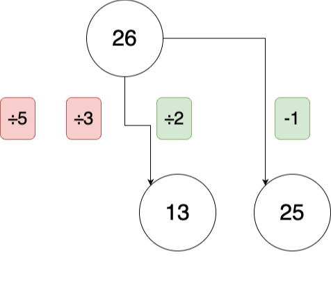 Top-Down 방식으로 설명하면, 26이 되려면 4가지 경우가 있다. 4가지 경우 중 최소 연산횟수에 +1 한 값이 26의 연산횟수가 된다. ÷5, ÷3, ÷2, -1 의 연산횟수 중 최솟값에 +1을 하여 26의 연산횟수를 구한다.