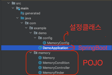 DemoApplication은 MemoryConfig를 컴포넌트 스캔한다. ( memory 디렉토리는 DemoApplication의 하위디렉토리가 아니므로, 컴포넌트 스캔을 하지 않는다. 그저 POJO이다.