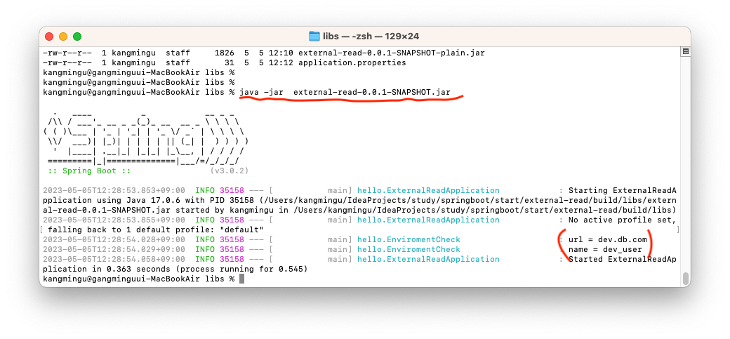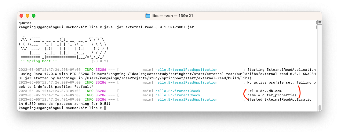실행결과를 확인하면 name의 값으로 outer_properties가 출력됨을 확인할 수 있다. 내부보다는 외부설정파일이 우선순위가 더 높다.