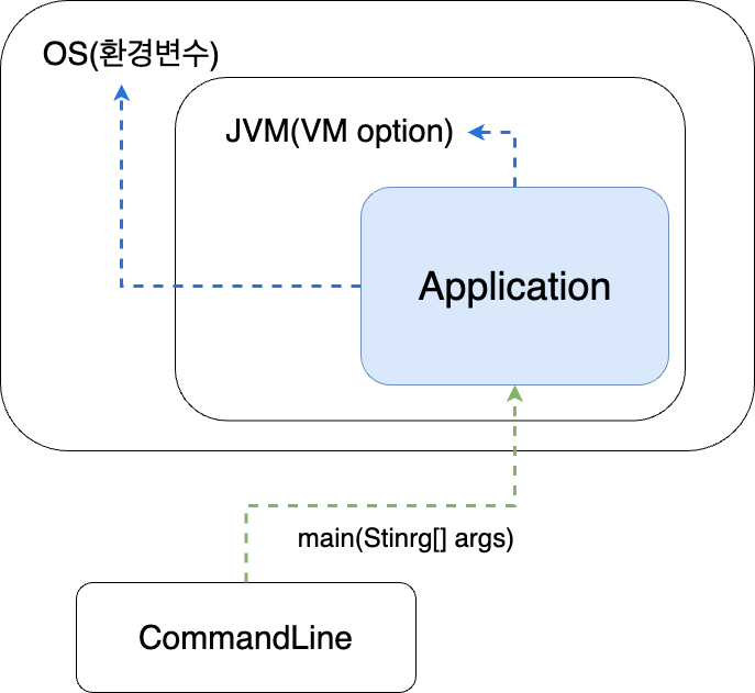 지난 포스팅에서 Application이 외부설정을 가져오는 3가지 방법을 알아보았다. Application은 OS의 환경변수, JVM의 VM옵션 그리고 CommandLine에서 외부의 설정을 넘겨받을 수 있다. 외부 설정의 개수가 적으면 3가지 방식이 유용하지만 설정의 개수가 많으면 외부에 파일을 하나 두고 관리하는 것이 좋다.