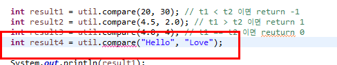 int result3 = util.compare(4.0, 4); // t1 == t2 이면 reuturn 0