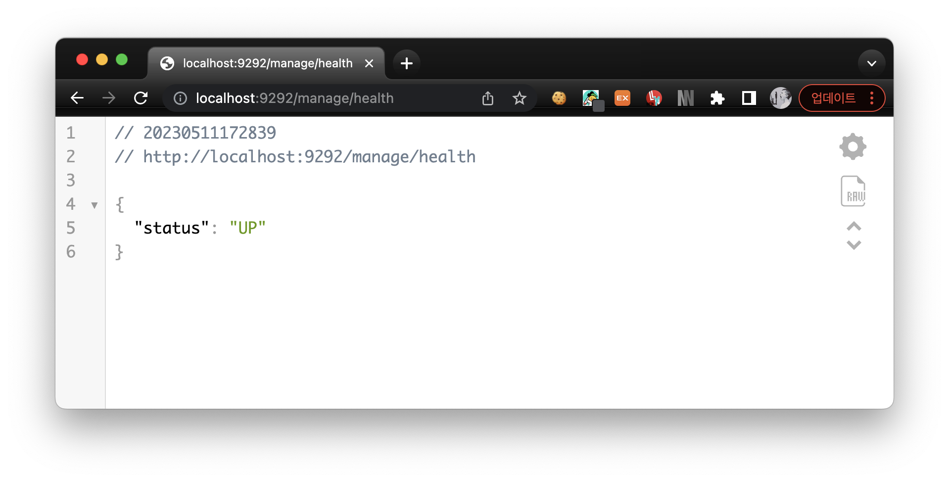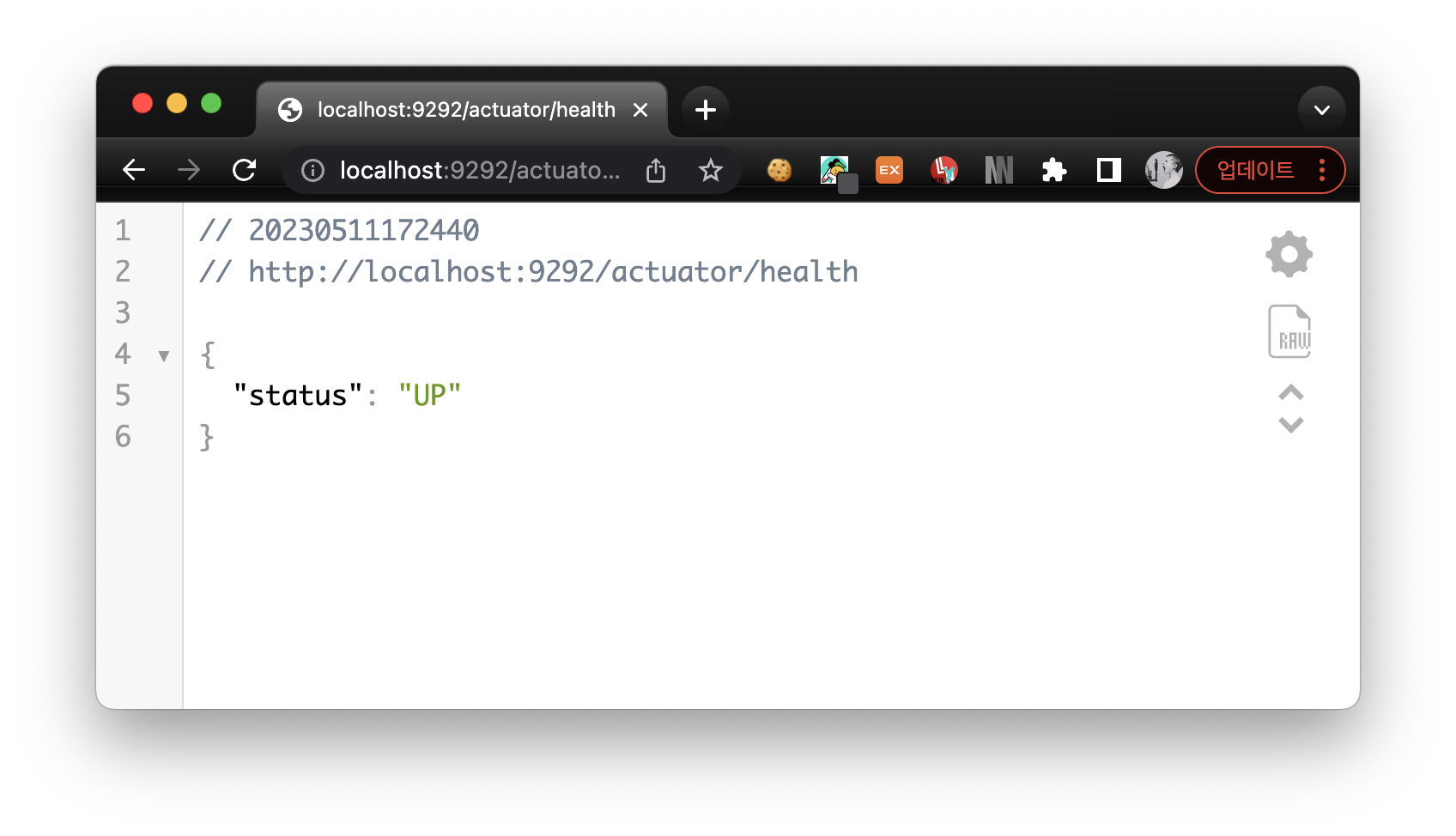 http://localhost:9292/actuator/health 로 접근이 되는 모습이다.