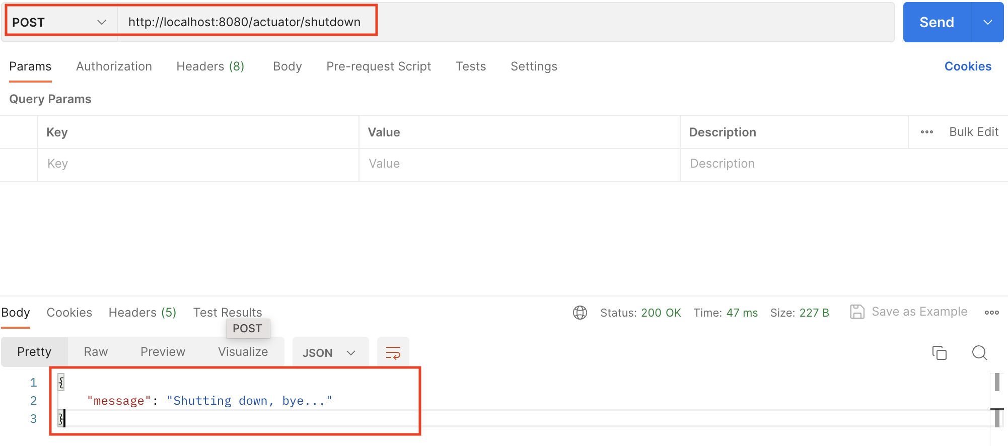 shutdown은 GET방식이 아닌 POST방식으로 동작하므로 Postman같은 프로그램을 사용하여 테스트해보면 된다.