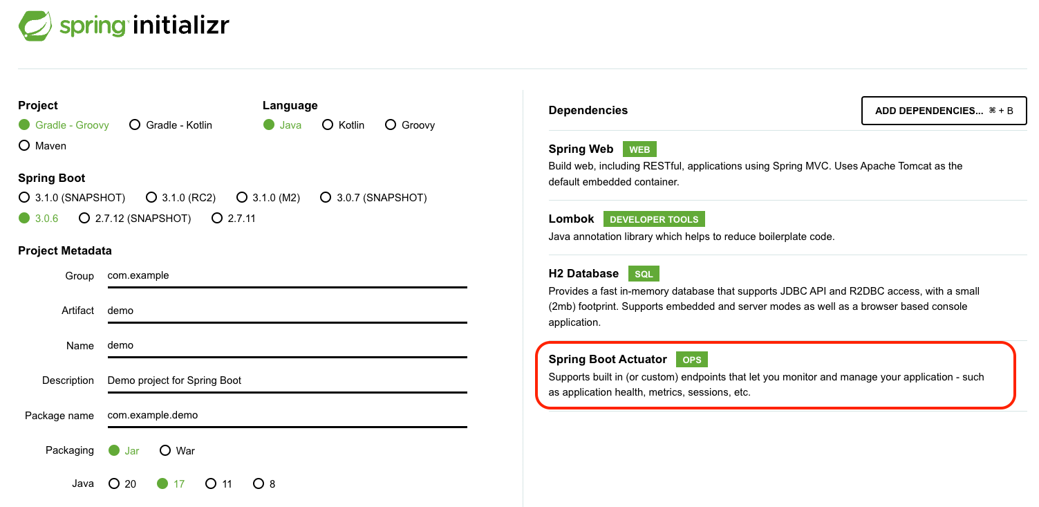 implementation 'org.springframework.boot:spring-boot-starter-actuator' // 엑츄에이터