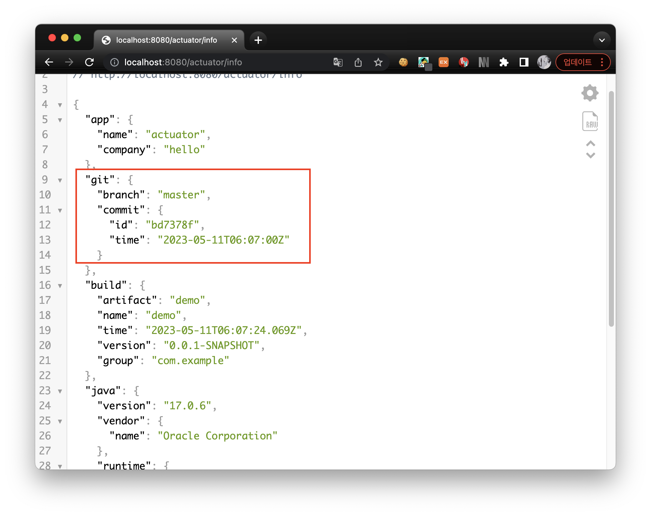 git.properties 파일이 생성되었음을 확인할 수 있다. info 엔드포인트를 확인해보자.
