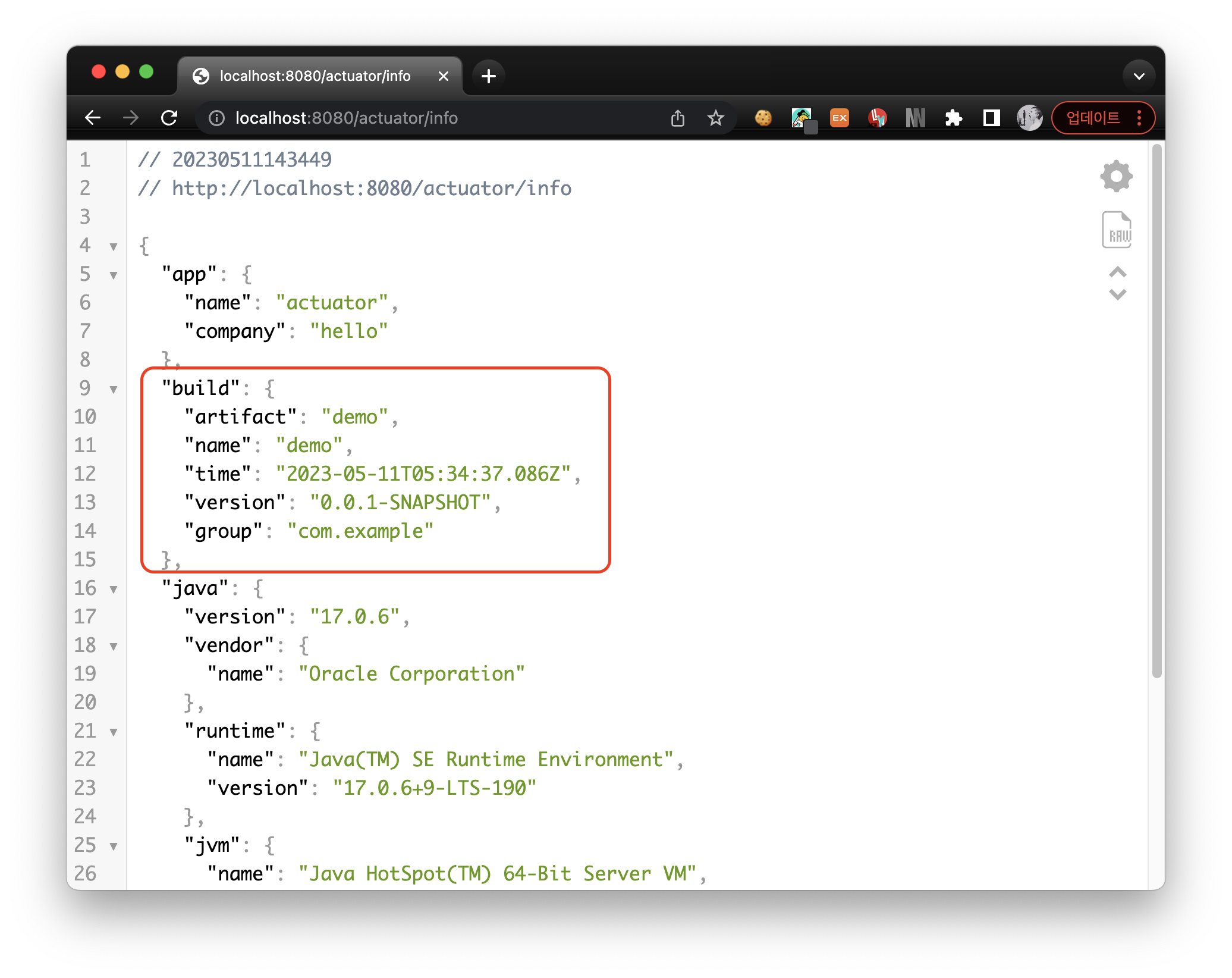 Build 정보도 노출해보자. 빌드 된 시간, 버전, 이름 등의 데이터도 확인 가능하다.