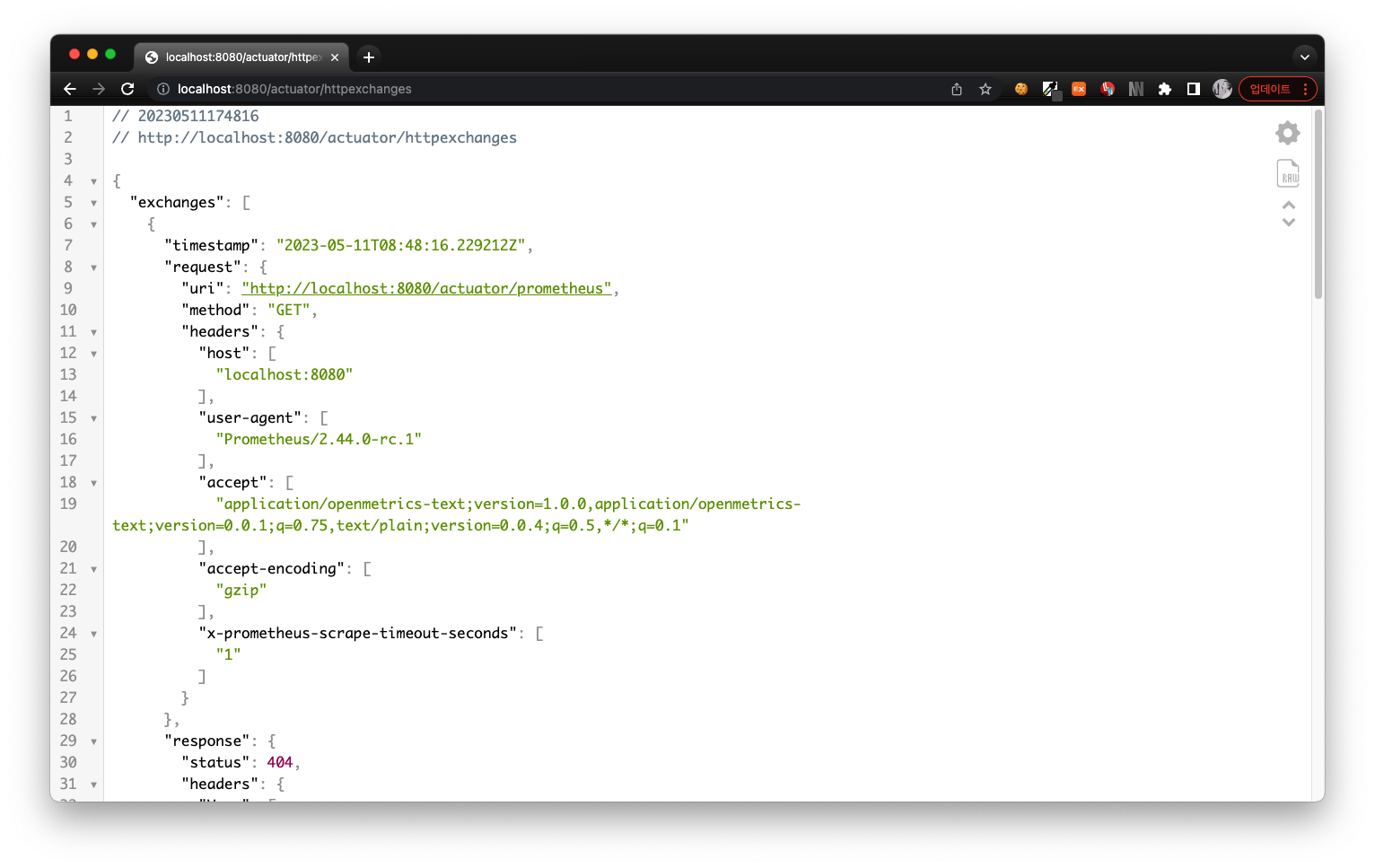 http://localhost:8080/actuator/httpexchanges 로 접근하면 request와 response 기록이 노출된다.