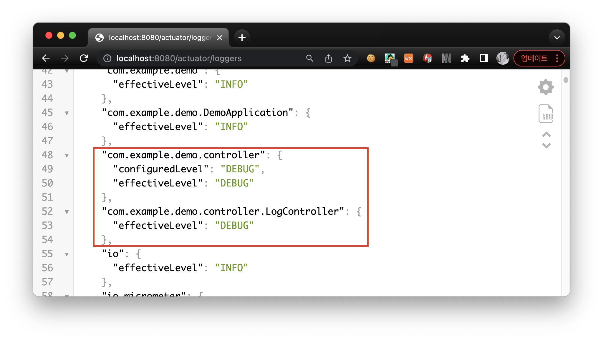 LogController가 속한 패키지의 로그레벨을 Debug로 설정한다. SpringBoot 프로젝트를 실행하여 loggers 엔드포인트 로그레벨을 확인해보자.