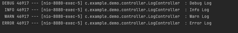 롬복에서 제공하는 @Slf4j 어노테이션으로 각 레벨별 로그를 찍는 Controller를 하나 만든다.