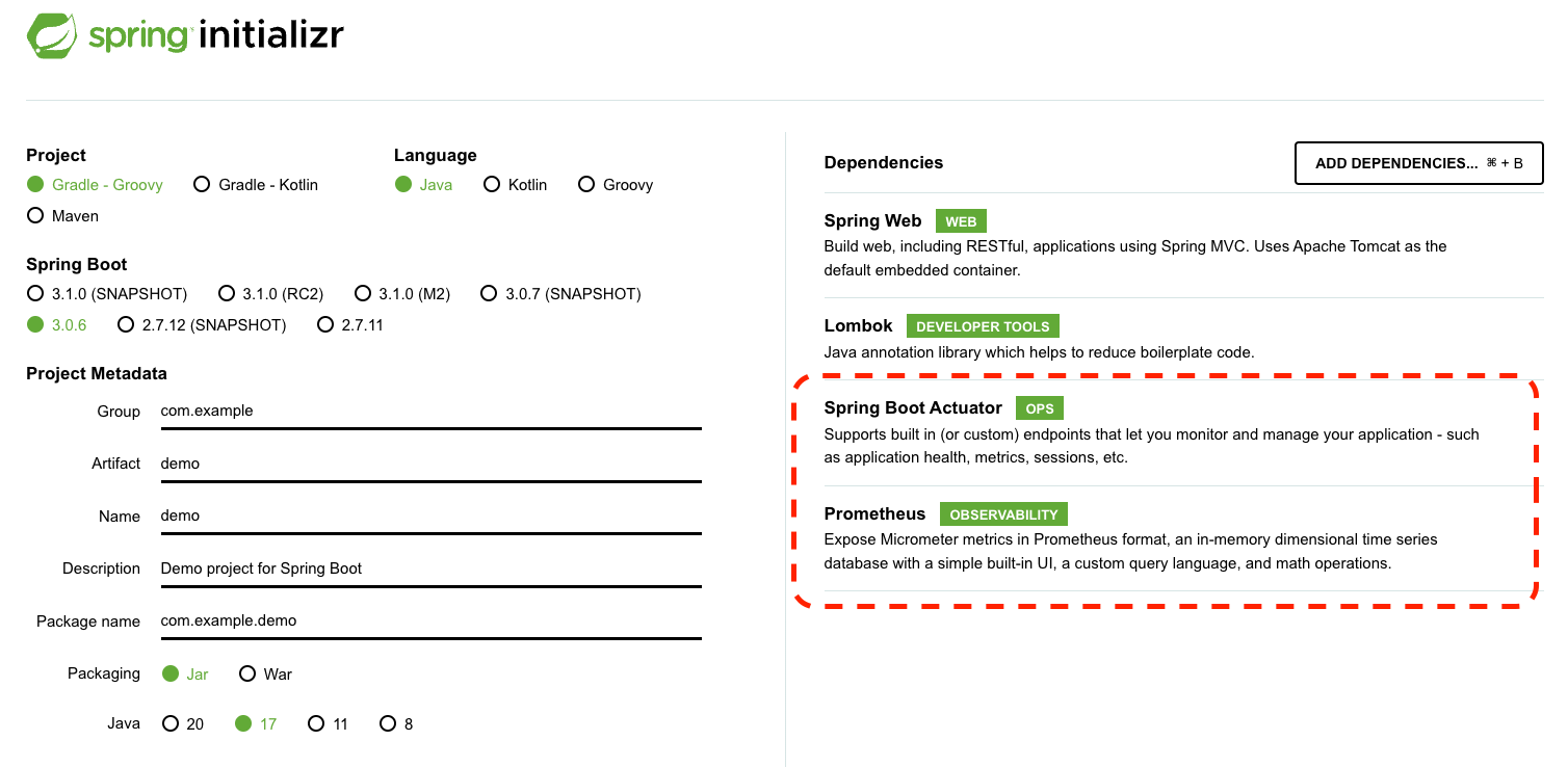 스프링 부트 프로젝트 생성시, Actuator와 Prometheus를 디펜던시로 추가한다.