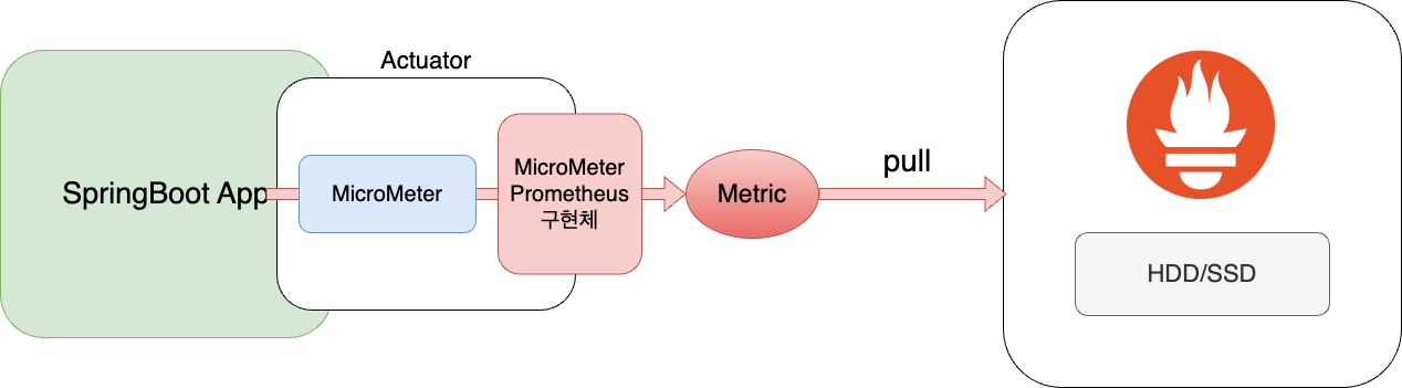 프로메테우스는 마이크로미터가 수집한 메트릭 데이터를 일정시간 간격으로 PULL하여 DB에 수집한다. 이때, MicroMeter Prometheus 구현체가 필요하다. 마이크로미터는 수집한 메트릭을 JSON 방식으로 전달하지만 프로메테우스는 JSON 데이터를 처리하지 못한다. 그래서 마이크로미터와 프로메테우스 사이에는 JSON 데이터를 프로메테우스가 처리가능한 데이터 형식으로 변환하는 구현체가 필요하다. 그것이 MicroMeter Prometheus 구현체이다.