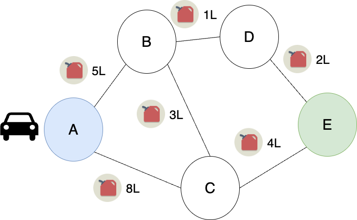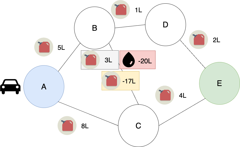 네비게이션이 A -> B -> D -> E 경로가 최적이라 알려주어도 운전자가 C로 이동하면 네비게이션은 C에서의 최단경로를 파악해야 한다. '현재'를 기준으로 최적해를 구해야 한다는 의미다. 또한 A -> B -> C -> A 로 가면 안 된다. 기름은 양수이다. 과거에 들린 지점을 다시 들리면 기름만 더 든다. 최적이라 할 수 없다. A에서 B로 이동하면 5L의 기름이 소비되지 기름이 채워지는 마법은 일어나지 않는다.