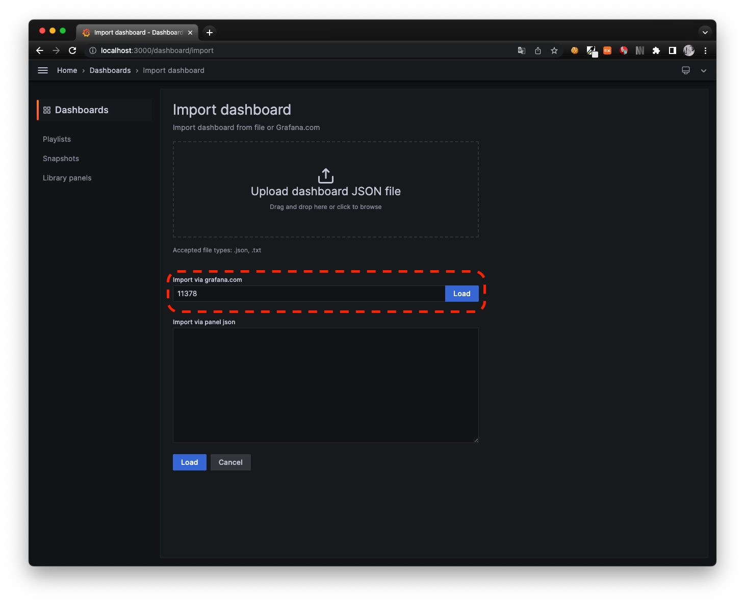 Import 화면이다. Load 버튼이 있는 란에 복사한 템플릿ID를 넣고 우측 Load 버튼을 누른다.