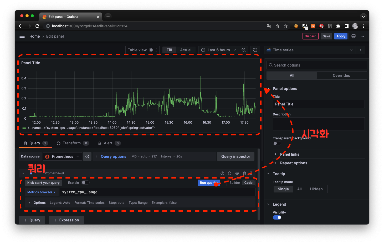하단은 쿼리를 날리는 영역이다. 쿼리를 넣고 Run queries 버튼을 누르면 Prometheus에서 데이터를 가져와 시각화한다.
