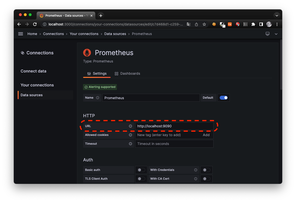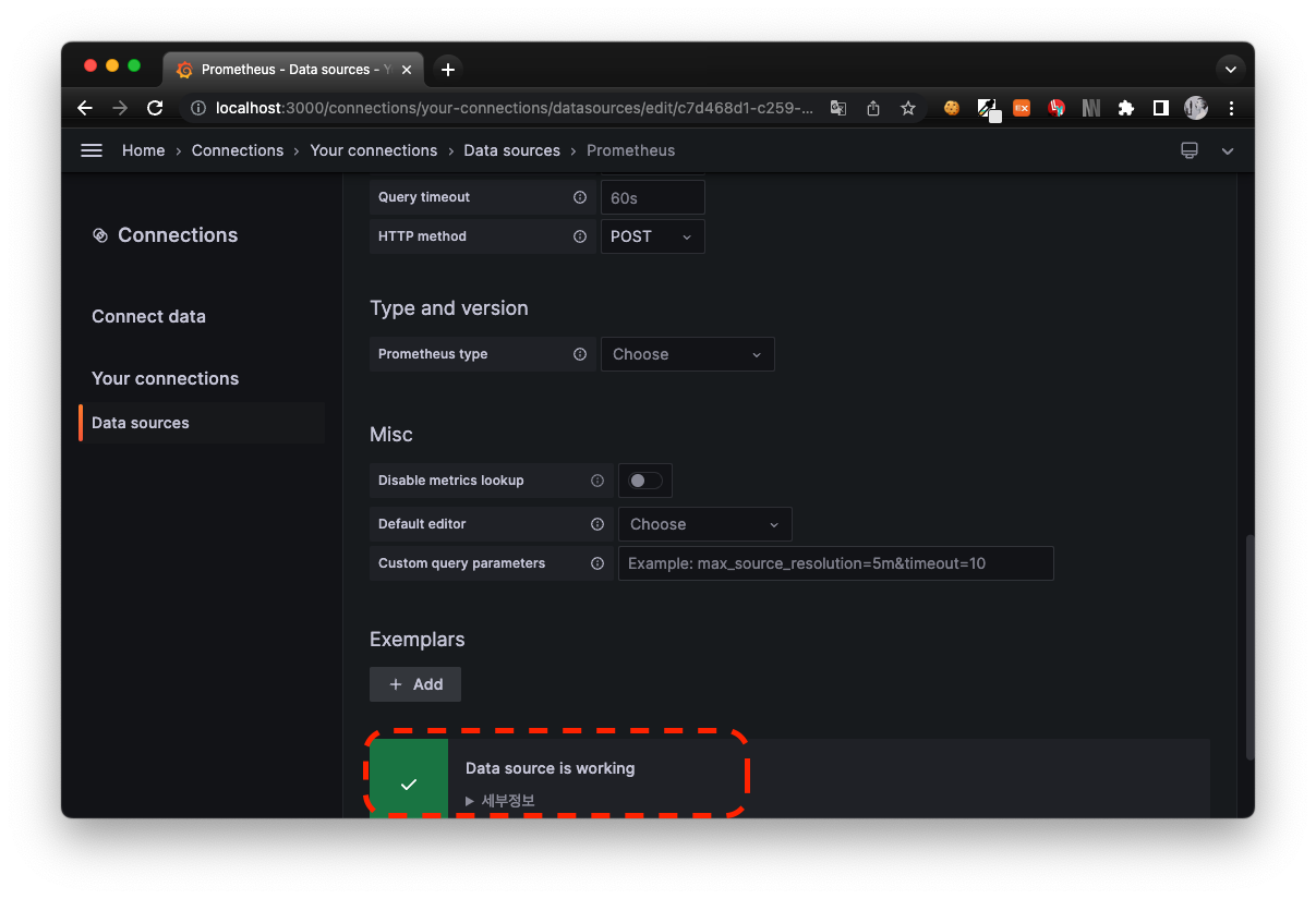 URL에 프로메테우스 로컬서버 주소인 http://localhost:9090을 넣어준다.