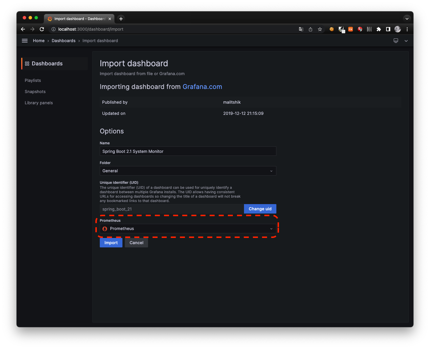 가장 하단에 프로메테우스로 설정하고 Import버튼을 누른다.
