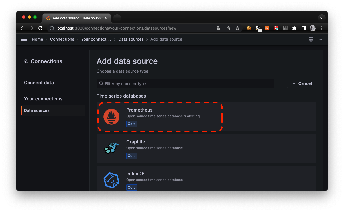 Add DataSources를 클릭하고 Prometheus를 선택한다.