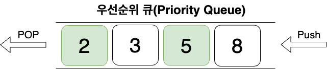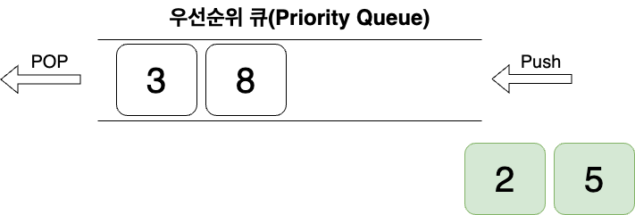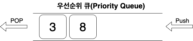 위 큐는 최솟값이 먼저 나간다. 현재 큐에는 3과 8이 들어가 있다. 이때 새로운 값을 PUSH 해보자.