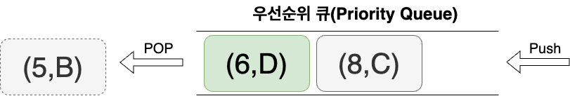 비용이 가장 적은 (6,D)가 먼저 POP 될수 있도록 재배열 한다.